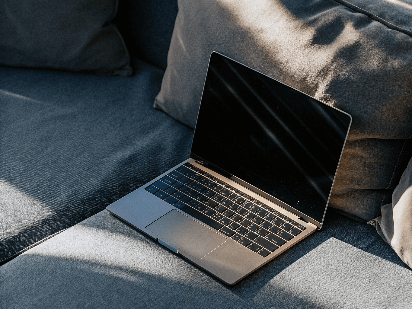 Centered composition of a laptop sits open on a plush sofa, its dark screen reflecting the ambient light. The placement suggests it was recently in use, now left idle in a comfortable and relaxed setting. The contrast between the sleek device and the soft surface beneath it creates a visual balance between technology and comfort. The cushions appear undisturbed, hinting at solitude or quiet productivity. Centered composition