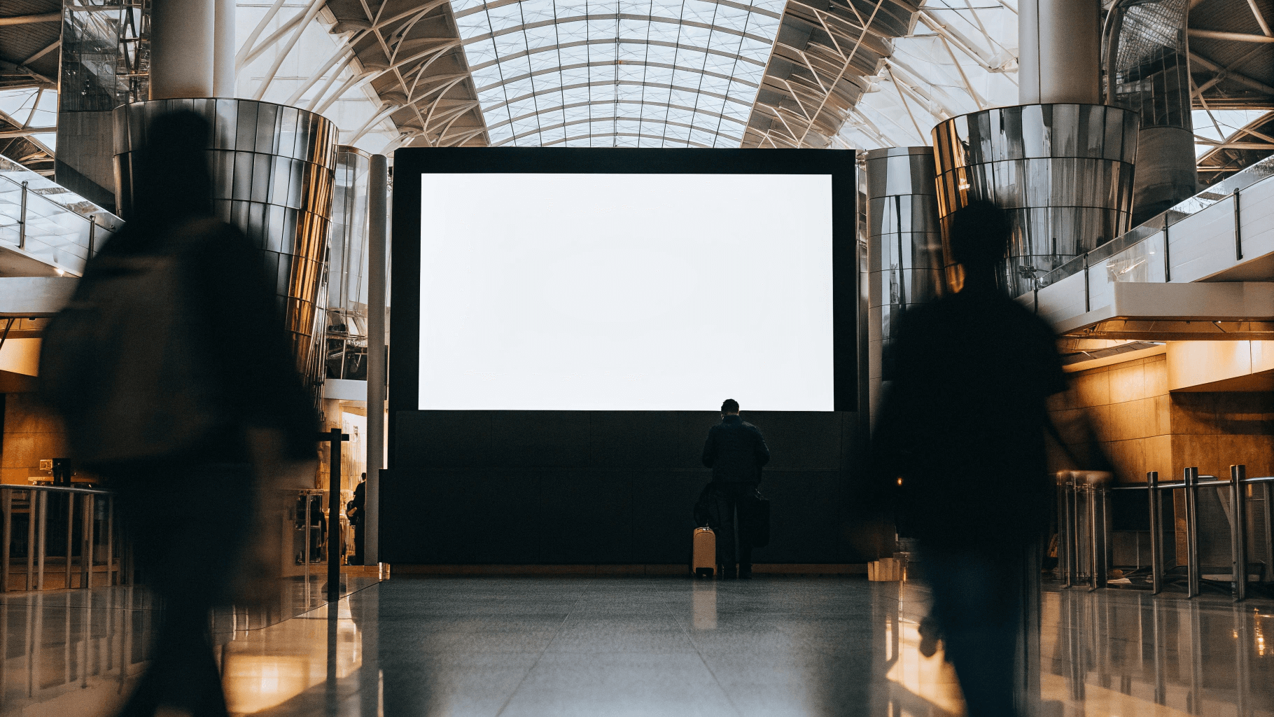 A large digital billboard installed inside a modern airport terminal, front-facing with minimal perspective and strong symmetry. The surrounding architecture features glass, steel, and polished floors that subtly reflect light. Blurred silhouettes of travelers move in the background, adding life without distracting from the billboard. The lighting is bright, neutral, and controlled, reinforcing a clean, contemporary aesthetic.
