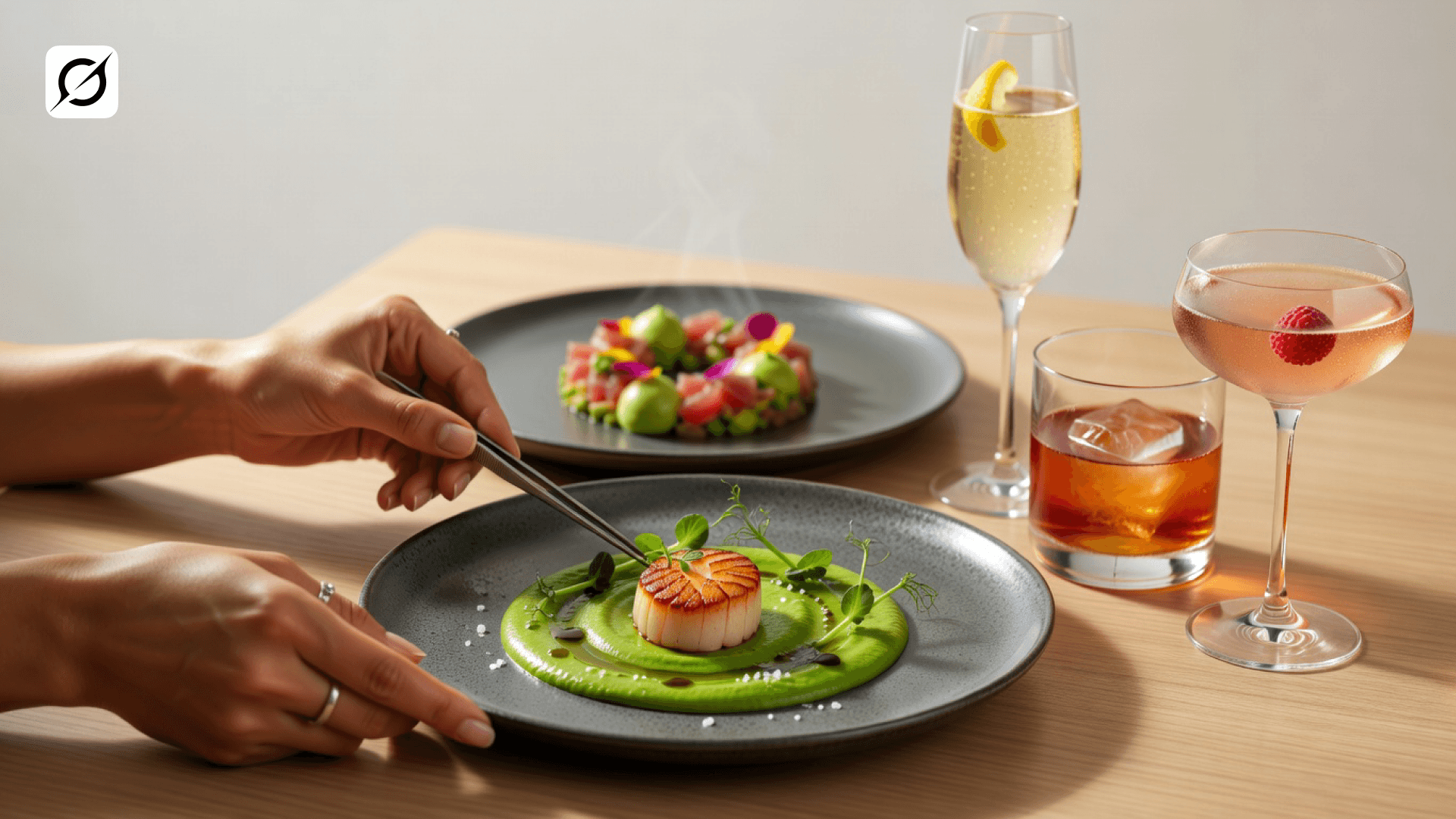 A natural white background with a matte black base and a centered deep dish plate in soft smoky gray. The image should resemble a professional top-down photoshoot for a high-end luxury restaurant with a monochrome gray theme. Generate the picture as a refined, high-end photoshoot of the plate.