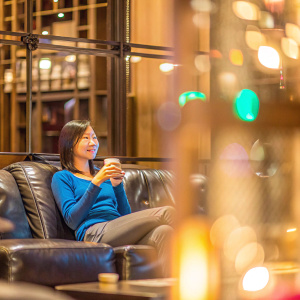 Young Asian woman in blue top and gray pants, sitting on a leather couch, holding a coffee cup. Soft focus, warm tones, and gentle bokeh effect create a cozy indoor atmosphere.