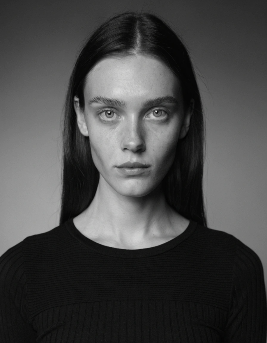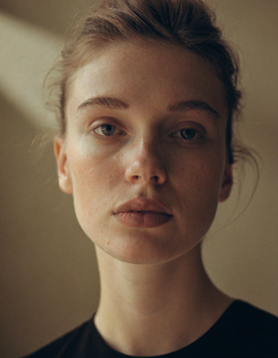 “Close-up portrait of woman in studio, face and shoulders filling frame, soft window light from left creating gentle shadows across features, muted earth tone palette, matte skin texture with natural detail, shallow depth of field f/2.8 with background softly blurred, slight film grain adding warmth, golden atmospheric glow, gentle rim lighting highlighting hair edges, natural elegant expression, contemporary editorial style, intimate framing, 85mm lens perspective”
