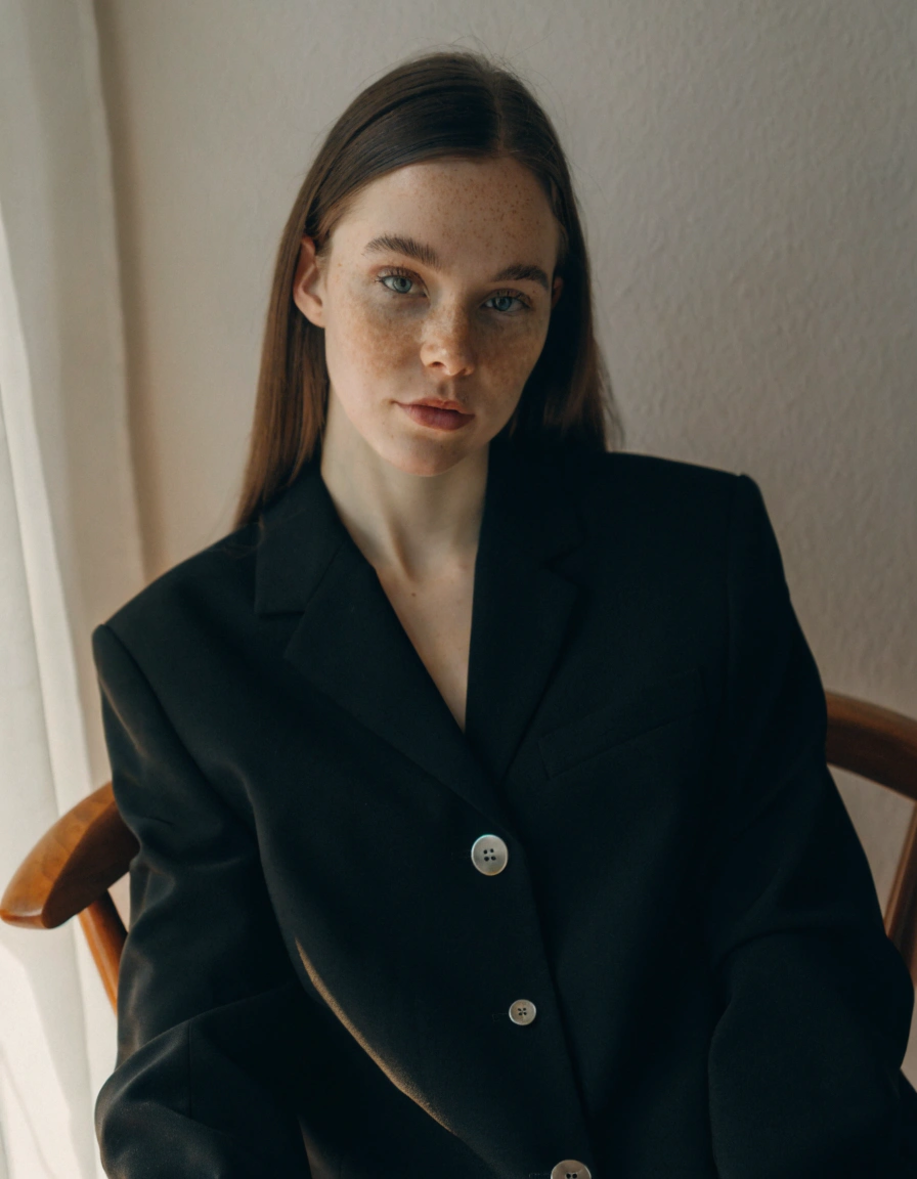 “Portrait of a woman in studio with soft window light from left, gentle shadows, warm golden hour glow, natural diffused illumination”