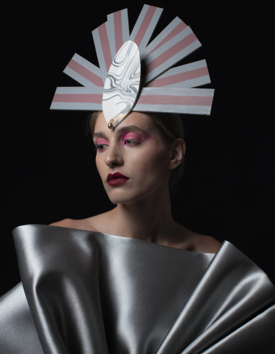 “Avant-garde fashion portrait, sculptural headpiece”
