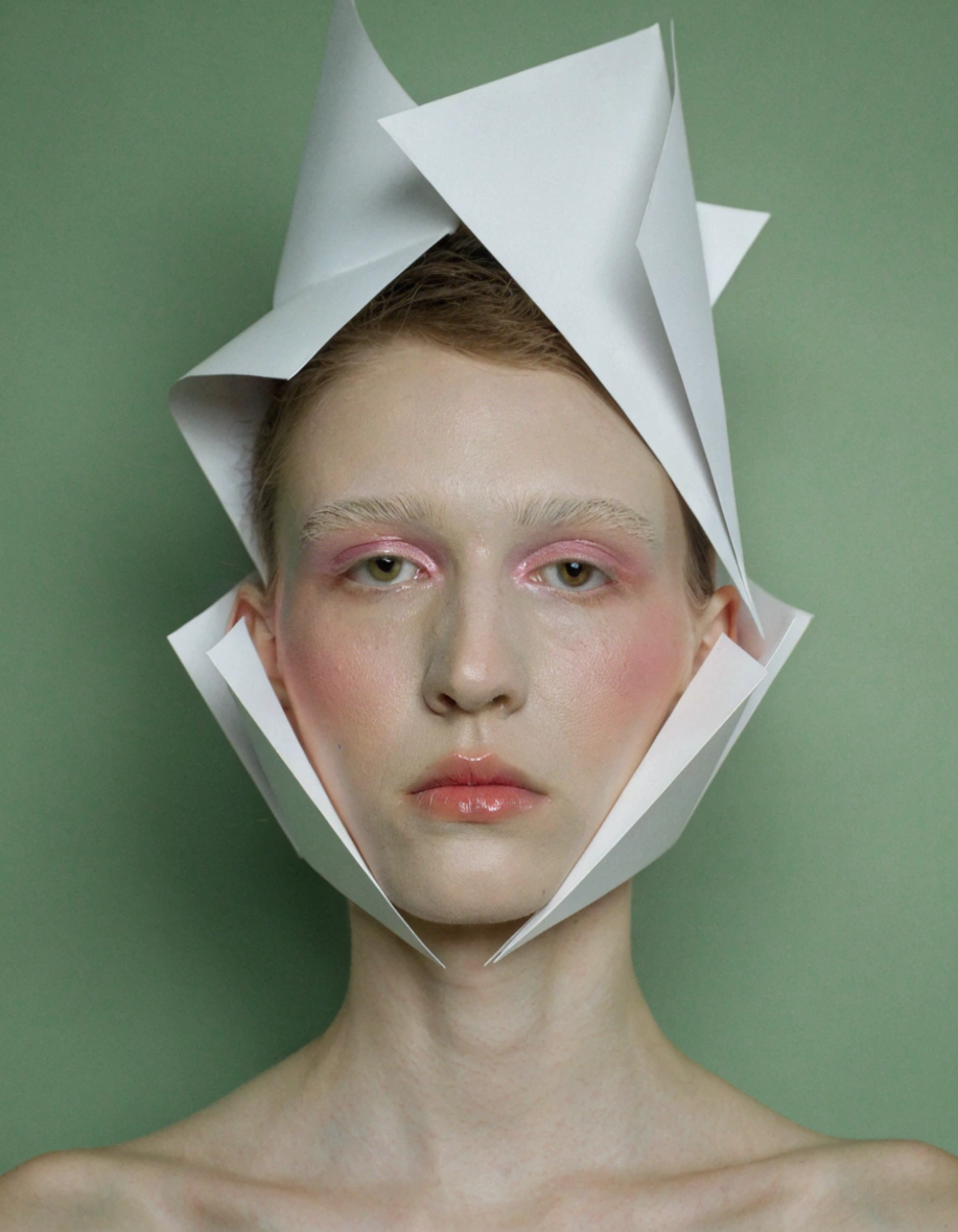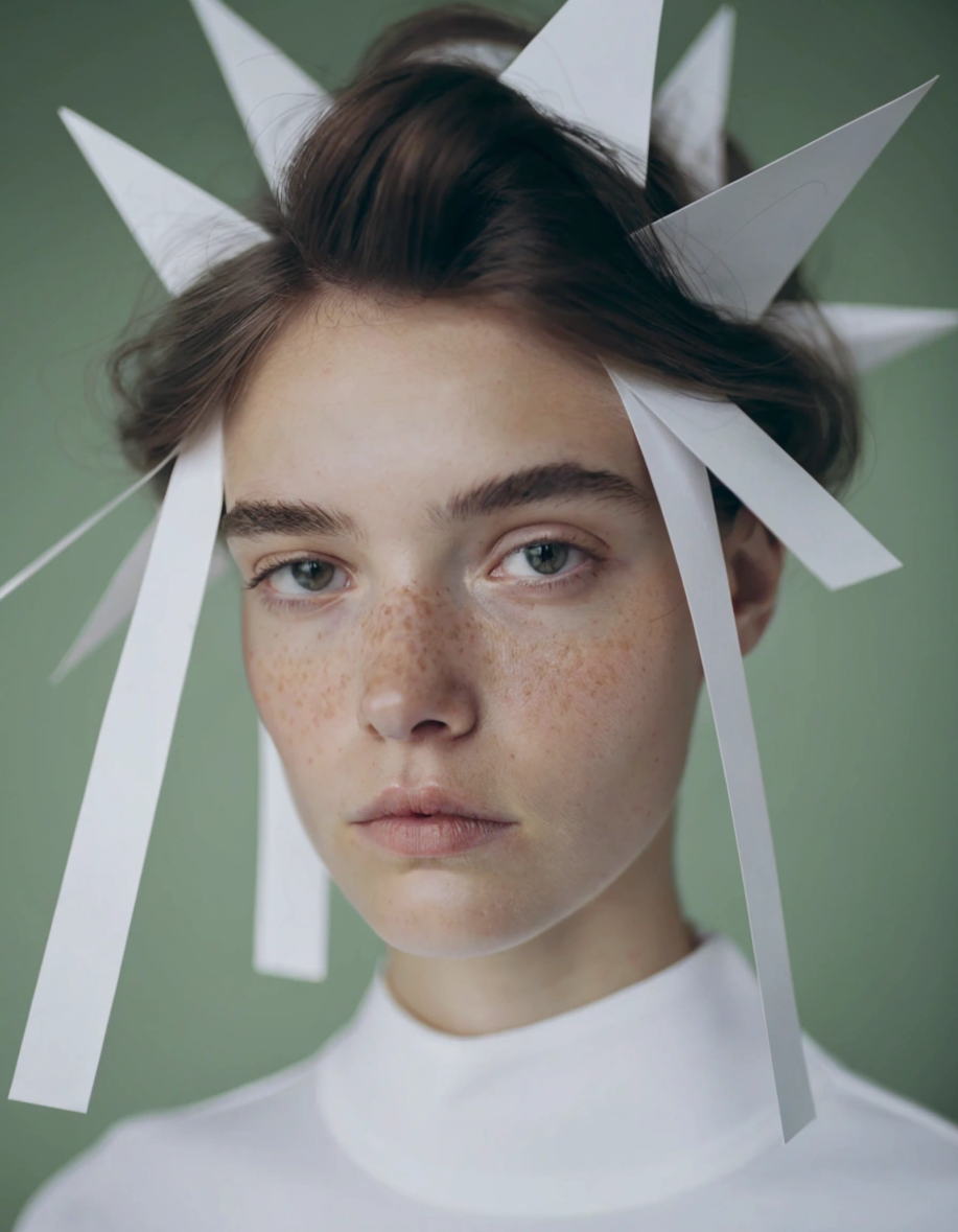 “Close-up avant-garde fashion portrait with dramatic white sculptural paper headpiece, model’s face and shoulders visible, muted sage green background, soft studio lighting, editorial style”