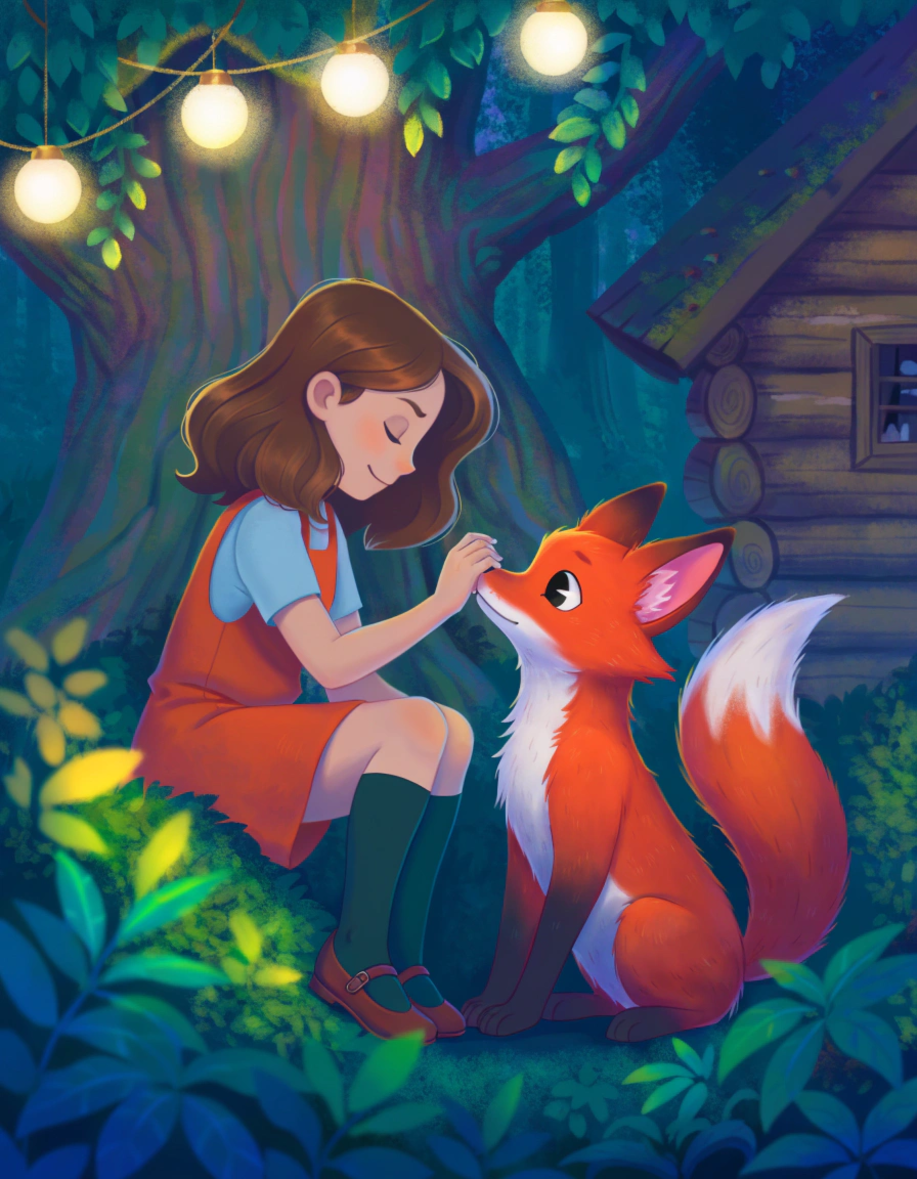 “Digital painting of child and fox in forest, smooth brushstrokes, layered blending, soft lighting effects, contemporary illustration style, vibrant colors, polished finish”