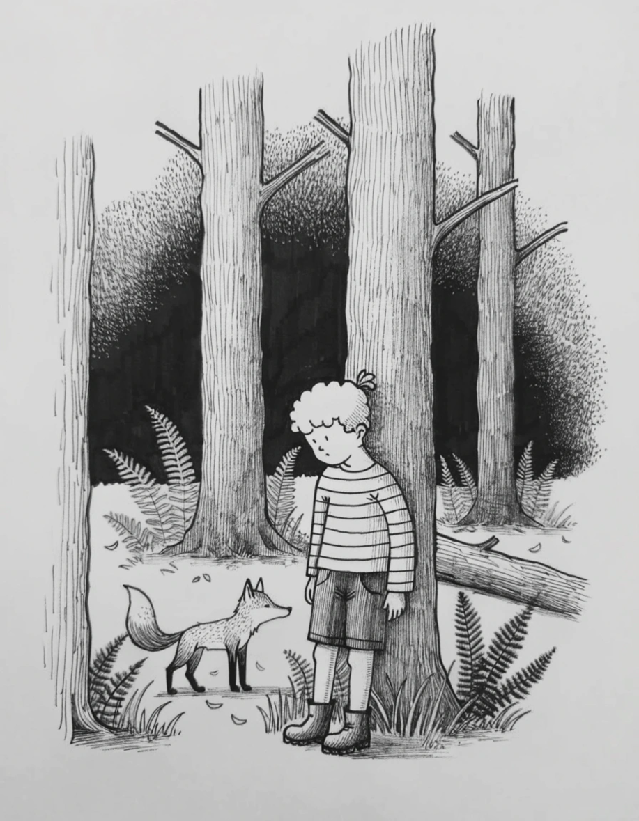 “Black ink illustration of child and fox in forest, bold line work, crosshatching shadows, high contrast, pen and ink technique, detailed linework, white paper”