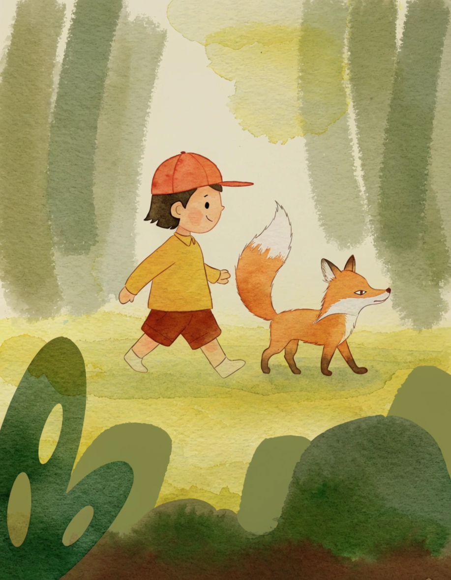 “Watercolor illustration of close up child and fox walking in the forest, soft diffused edges, flowing pigment washes, warm orange and green palette, visible paper texture, dreamy atmosphere, painterly style”