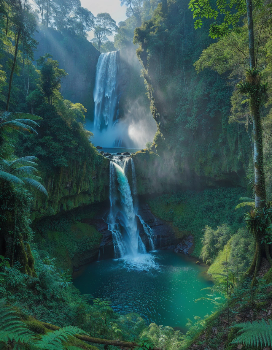 “Photorealistic wide shot of massive waterfall cascading into emerald pool deep in tropical rainforest, lush green vegetation covering every surface, morning mist