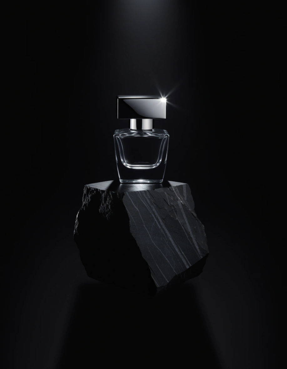 “High-end perfume product photography, elegant crystal bottle positioned on single geometric black obsidian block floating in void, dramatic spotlight from directly above creating sharp defined shadow beneath, rest in complete darkness, one precise beam of golden light hitting cap creating starburst reflection, ultra-minimalist composition with maximum negative space, luxury meets brutalist aesthetic, sharp focus throughout with f/11, museum-quality lighting setup, sophisticated contemporary commercial style, powerful visual restraint, Vogue-level editorial perfume shot”