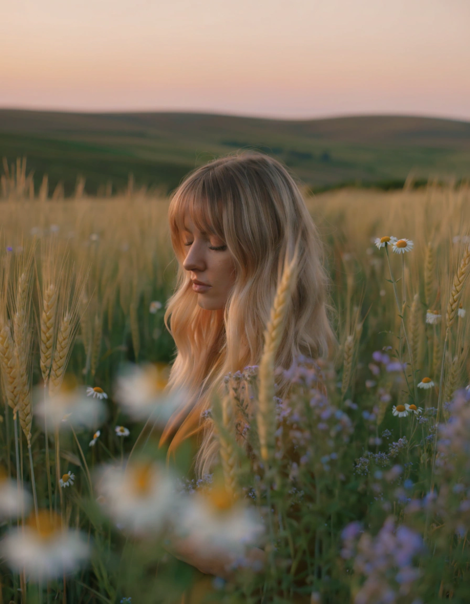 frame below, golden wheat and wildflowers surrounding her at shoulder level,