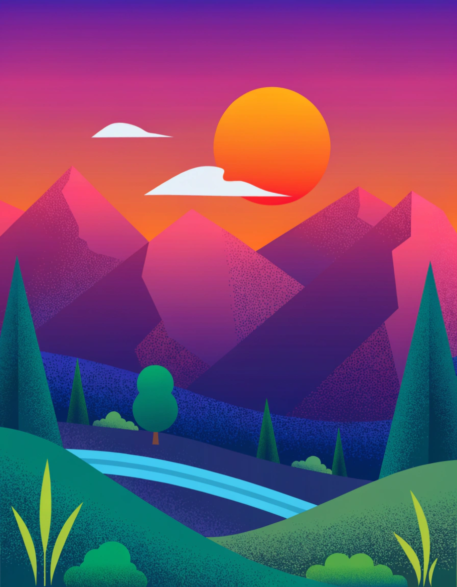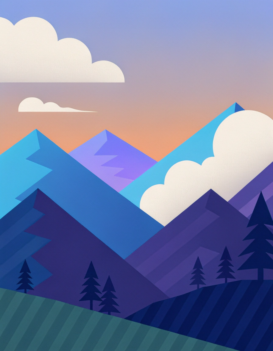 “Flat vector illustration of mountain landscape with layers, geometric peaks, stylized trees, gradient sky, bold outlines, modern graphic design style, balanced color palette”