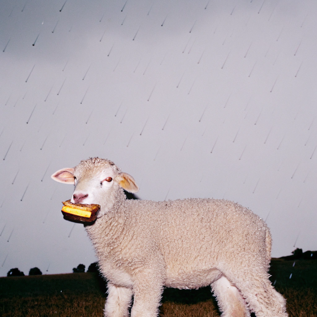 cute real lamb with raining storm background. there's a hamburger in the lamb's mouth