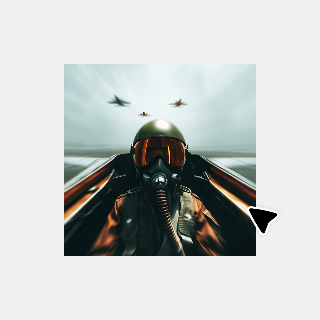 Black airplane flying extremely low over a winding road, closely following a motorcyclist. The setting appears dramatic, with warm lighting and a misty forested background, enhancing the sense of mood and creating a billionare rich vibe