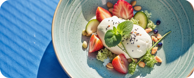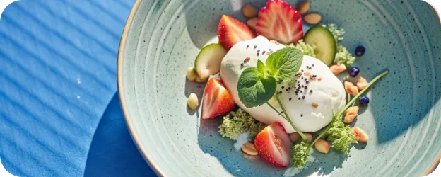 Photo-realistic image of Greek yogurt in a ceramic bowl topped with berries and honey, placed on a light linen napkin, natural sunlight from the side, warm neutral background, healthy and clean food styling
