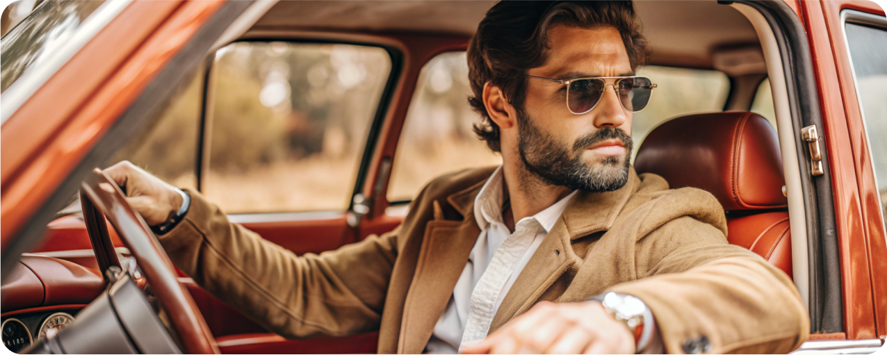 Retro car on quiet suburban lane surrounded by trees, blue and magenta sky glow, cinematic artwork.
