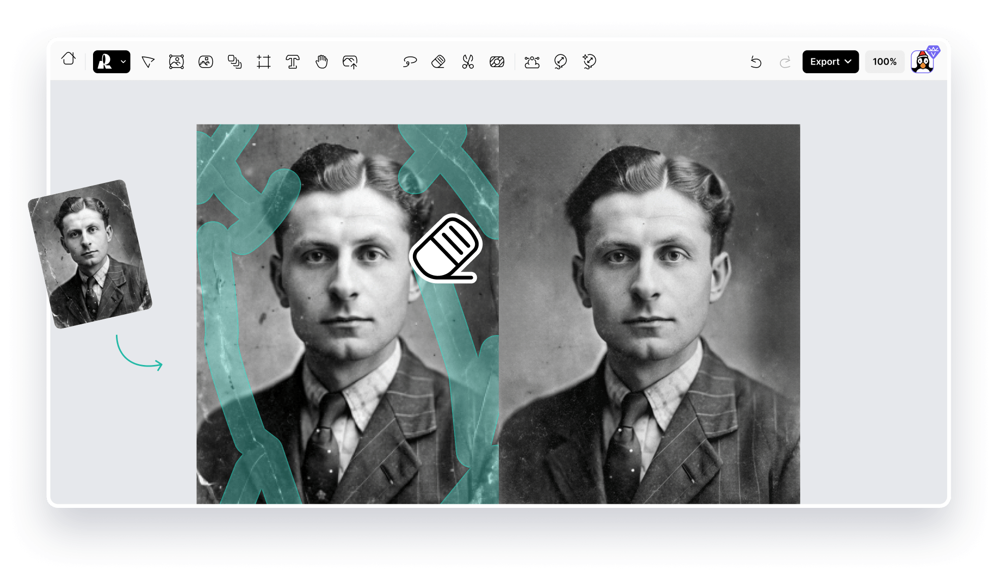 Yes. If your old photos have stains, tears, or creases, Recraft can improve their quality. Photo repair is simple with Recraft. Just upload a damaged, old photo and select the AI eraser.