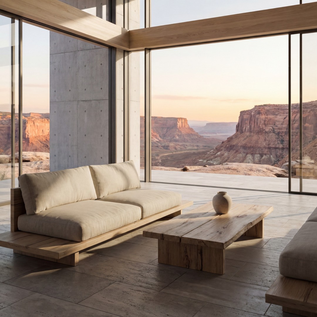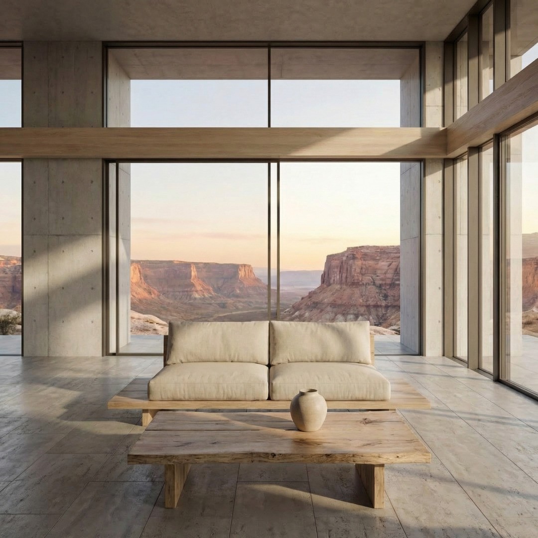 Recompose the interior scene to a perfectly centered, symmetrical front view